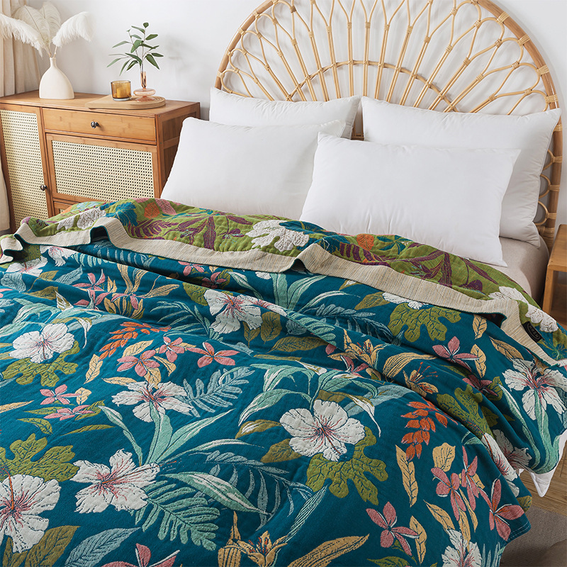 Botanical floral throw blanket displayed on bedBotanical Floral Throw Blanket – Cotton Jacquard