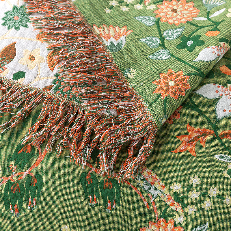 Elevate your space with the natural beauty of our Botanical Jacquard Throw Blanket. The vibrant green backdrop is brought to life with blooming florals, delicate leaves, and woodland animals—squirrels, birds, and rabbits—all finely detailed through jacquard weaving. It’s a nature-lover’s dream piece that effortlessly adds warmth and elegance to your room.