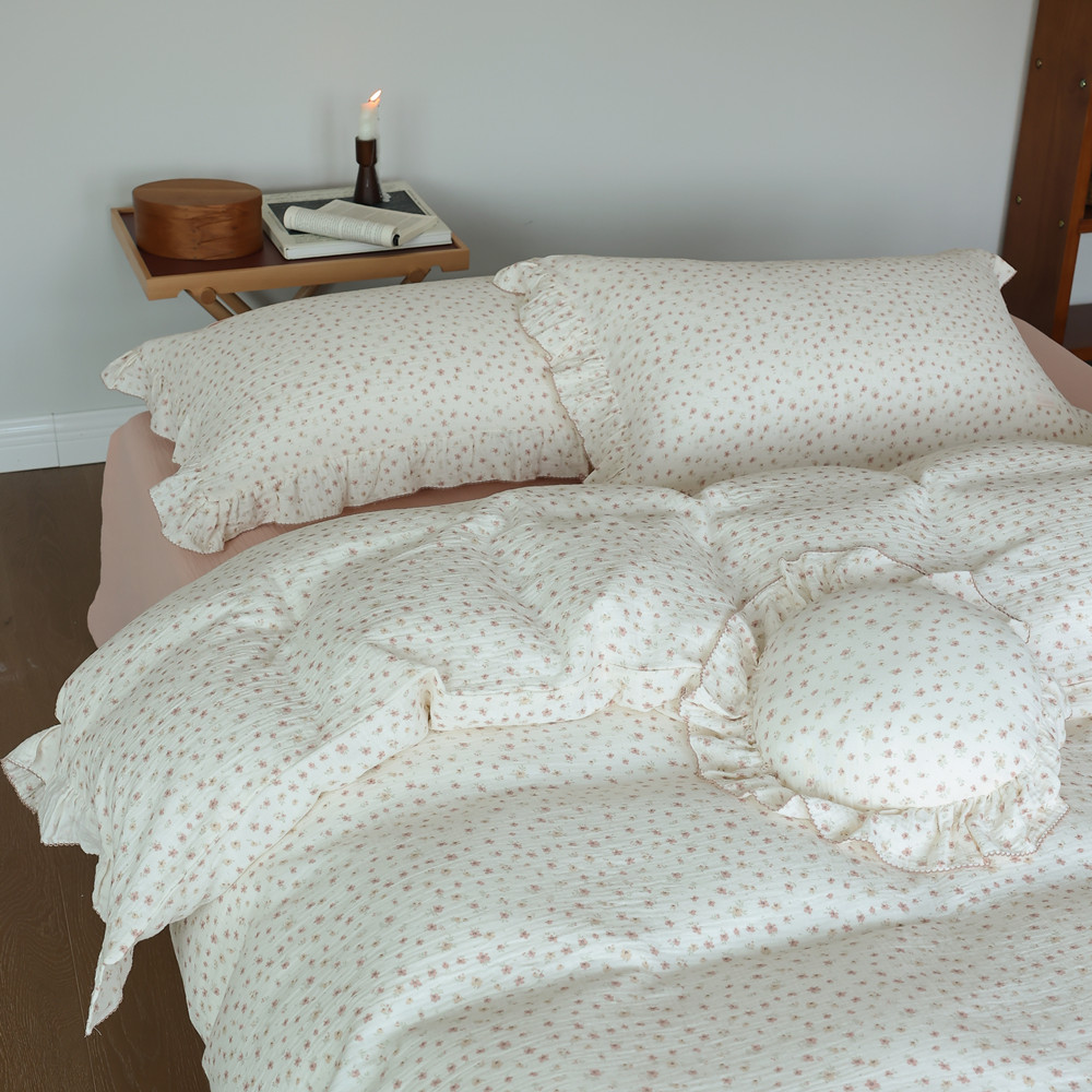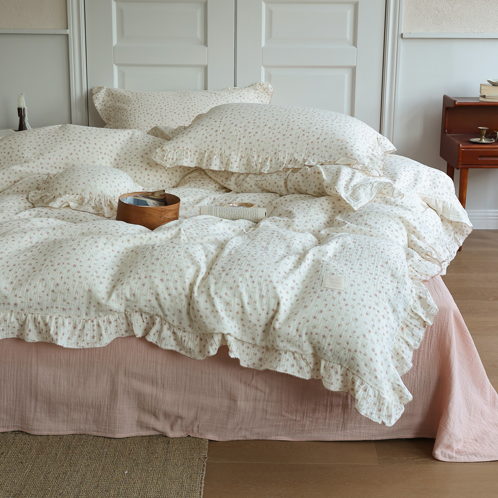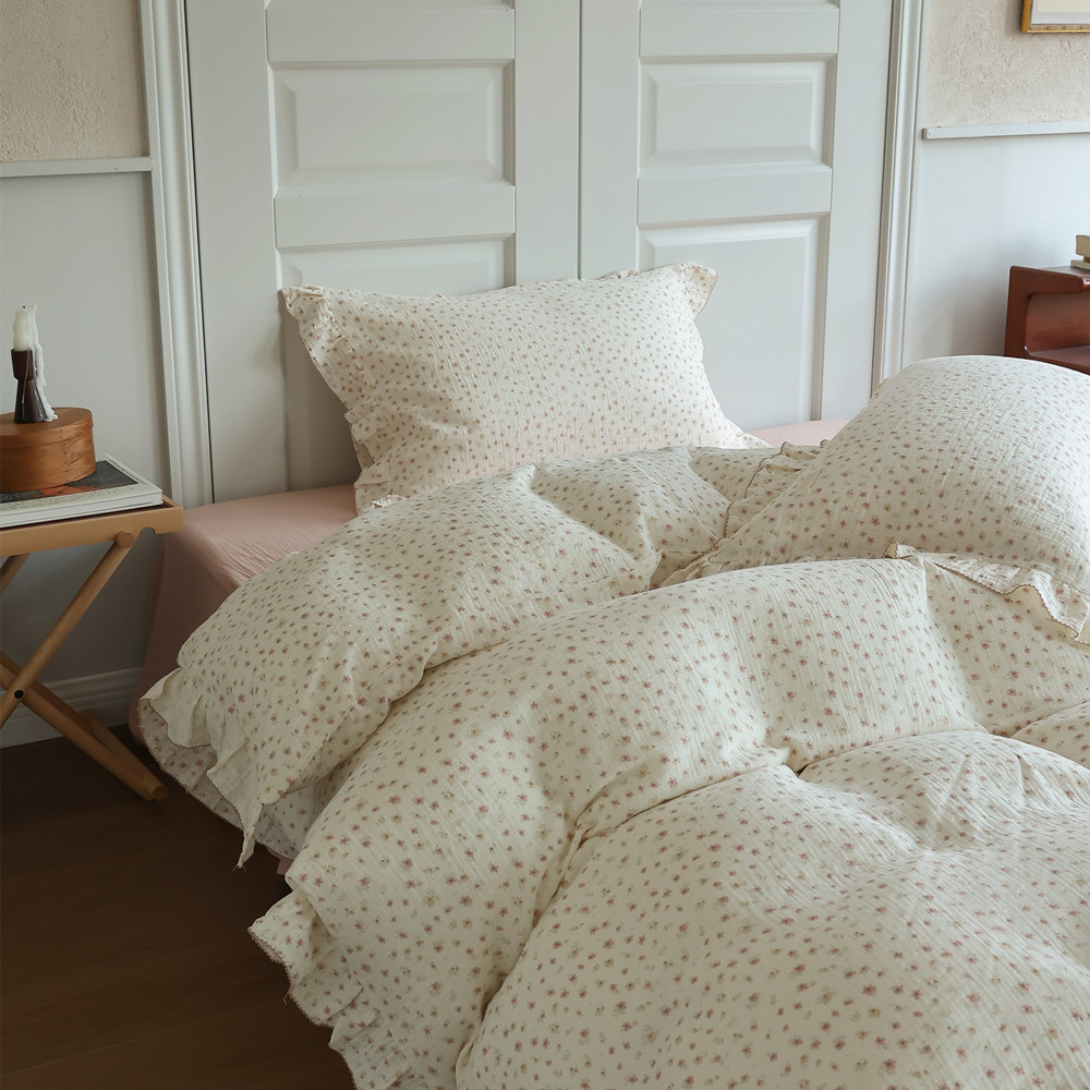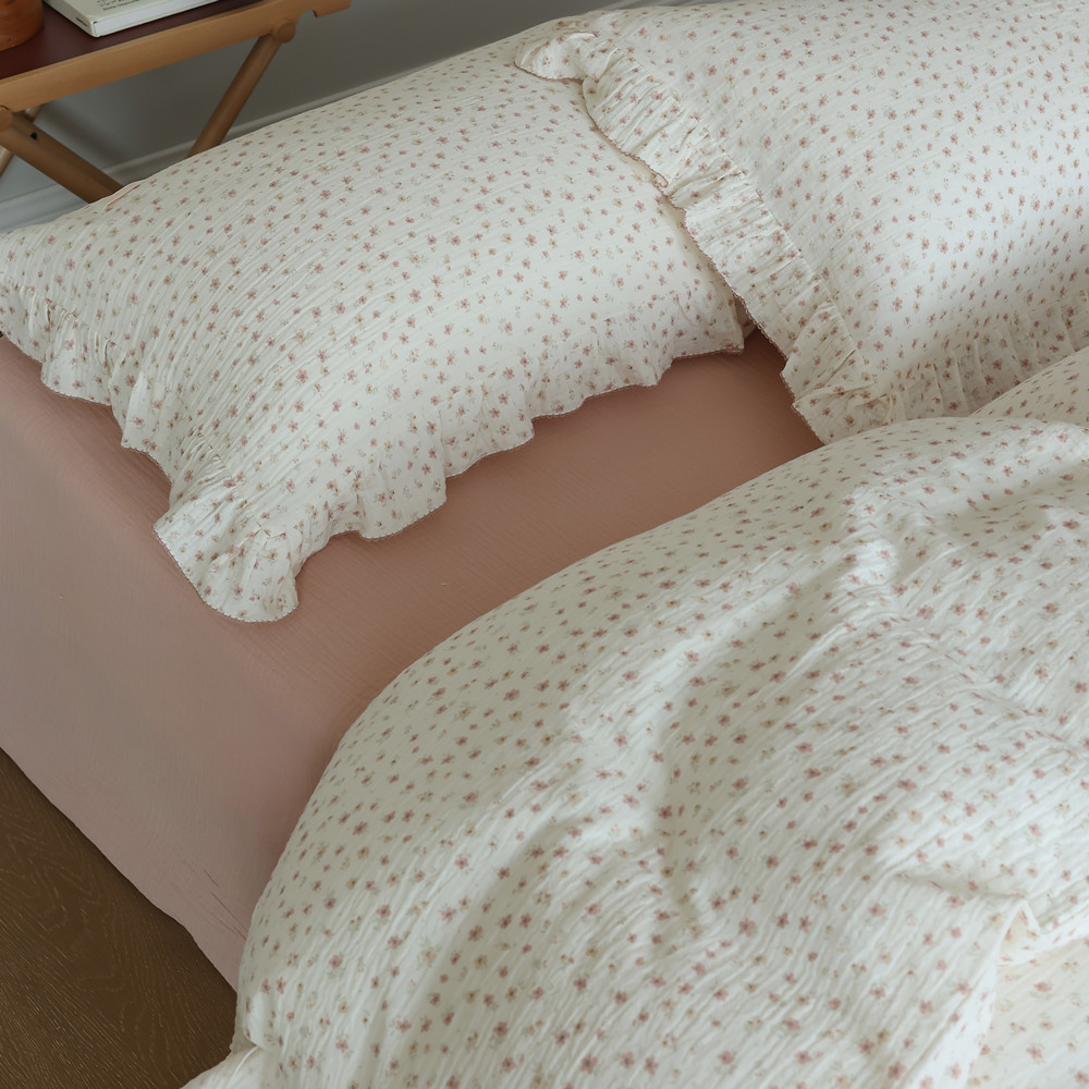The charm lies in the details—each piece in this cotton ruffle bedding set features carefully sewn ruffled edges that move gently with the fabric. The ditsy floral print adds playful femininity, while the solid flat sheet balances the look for a cohesive and calming bedroom palette. This set doesn’t just look good—it feels like a comforting hug at the end of each day.