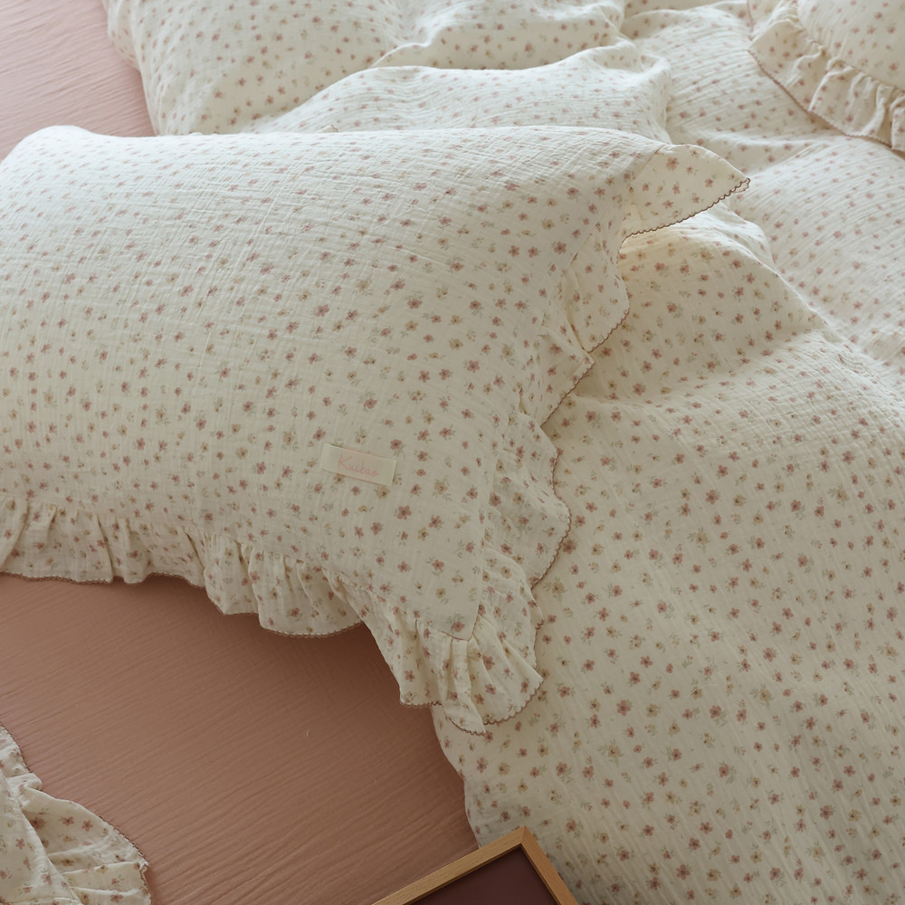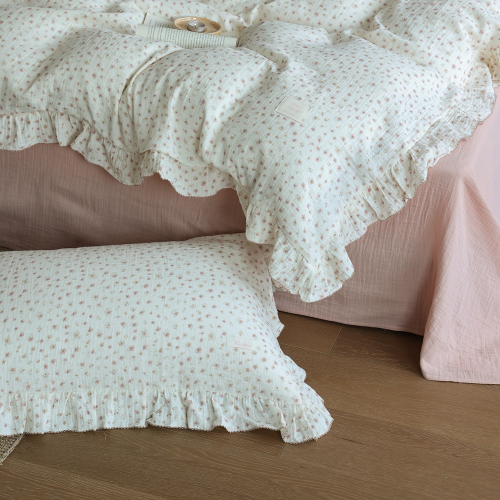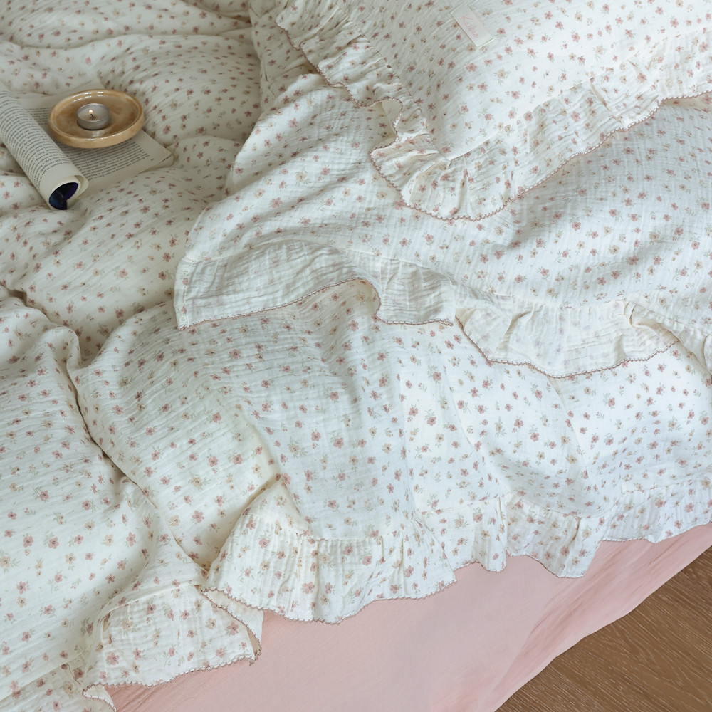 Made from 100% cotton muslin, this romantic cotton bedding is naturally airy and breathable, offering comfort in any season. It keeps you cool during warm summer nights and cozy when temperatures drop. The gauzy double-layer structure and gentle crinkled finish make it ultra-soft while adding natural texture to your bed. It’s easy to care for and becomes even softer with every wash.