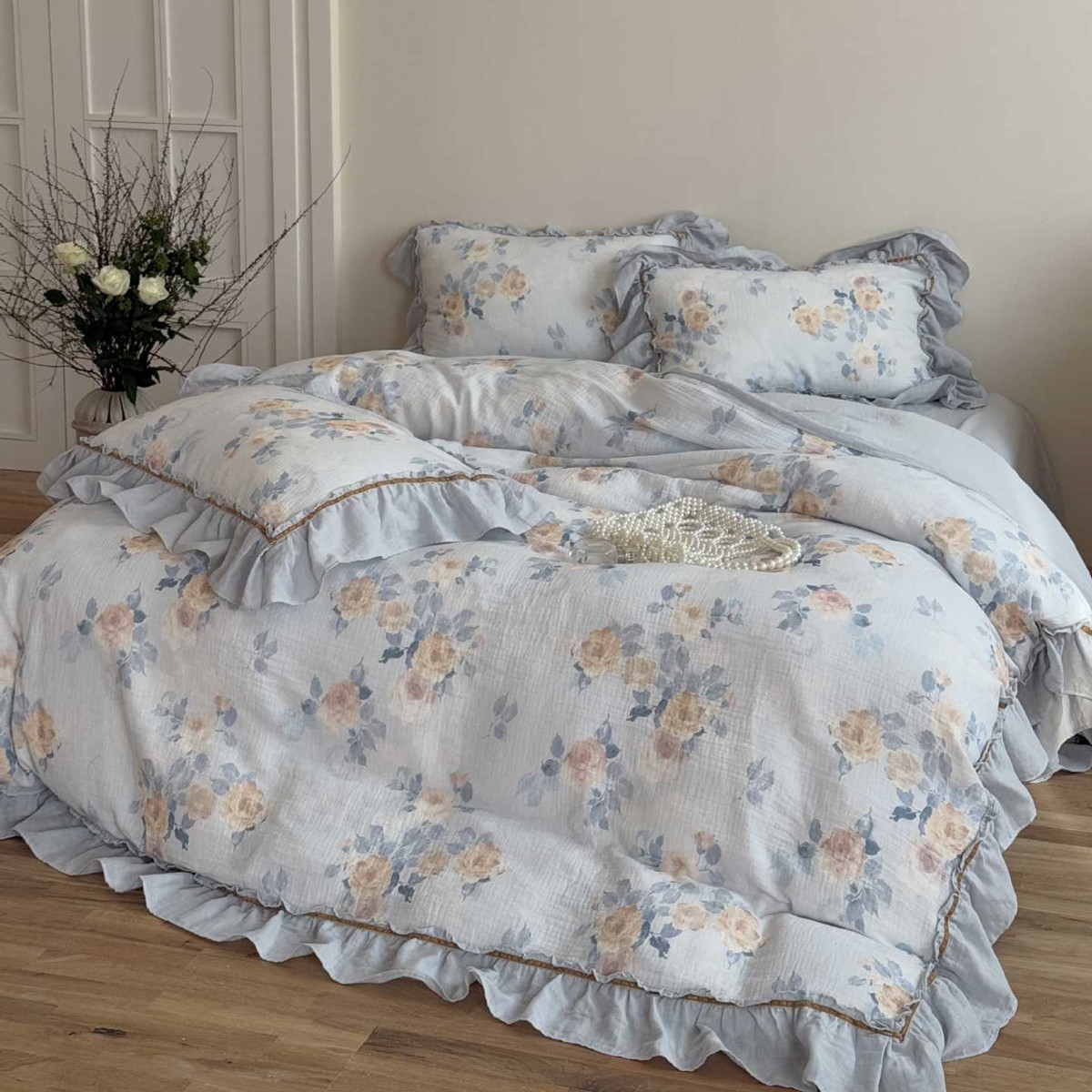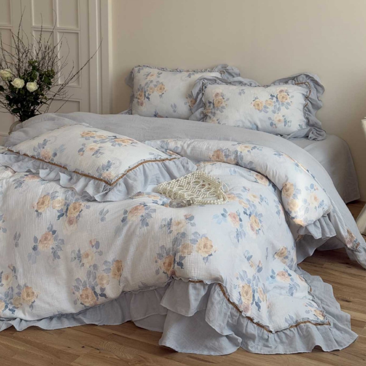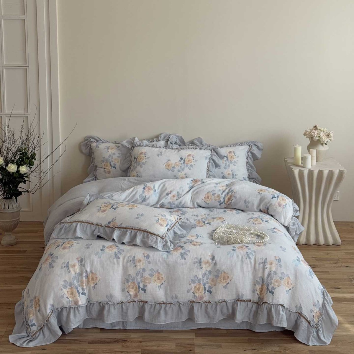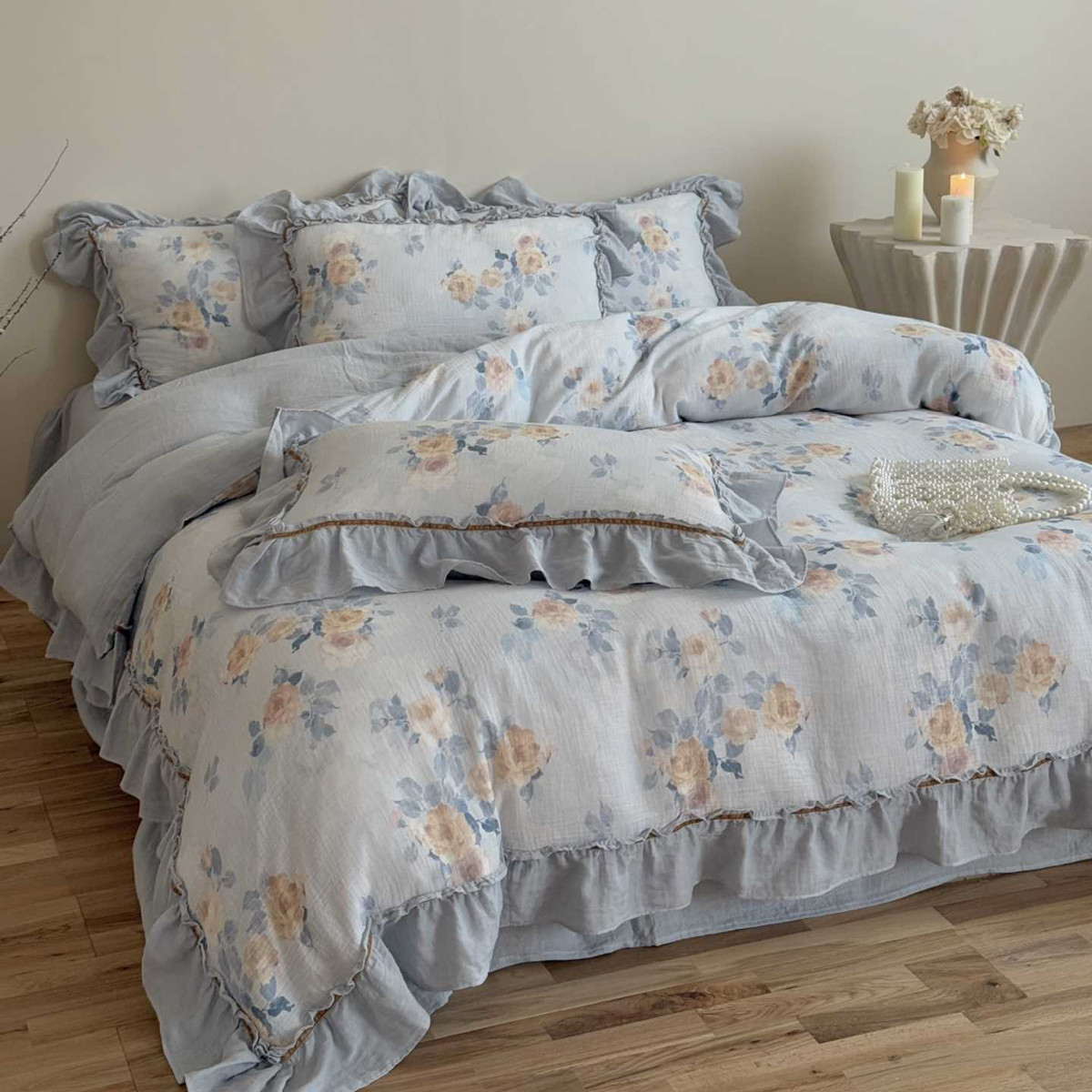 Dusty Blue Floral Gauze Bedding Set – Ruffled Elegance