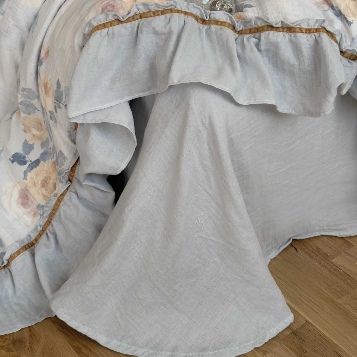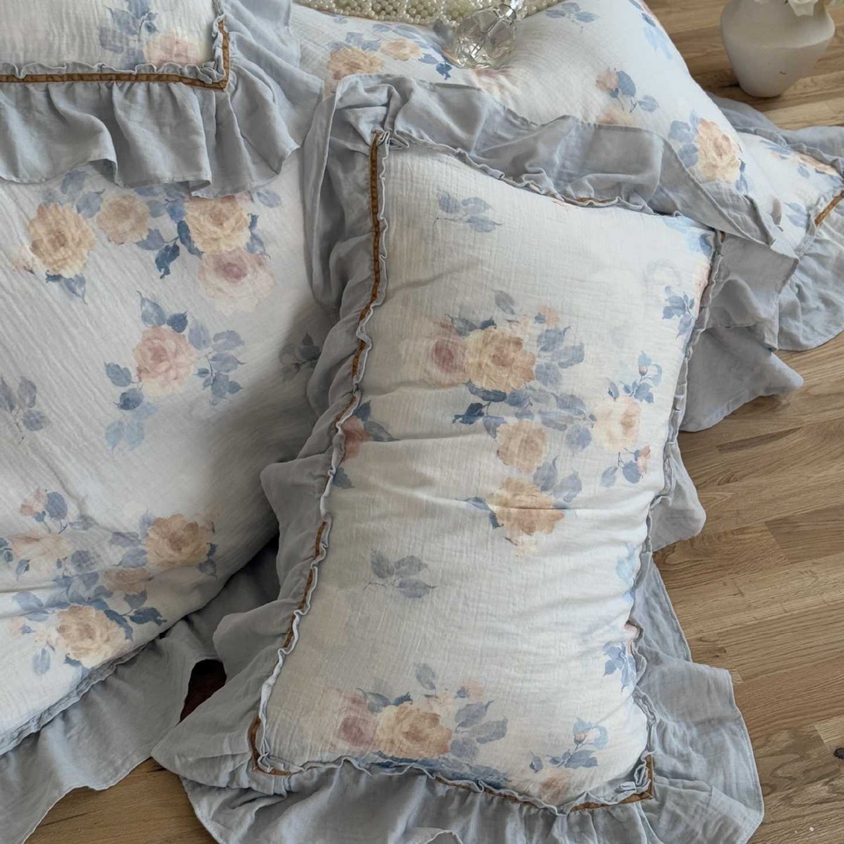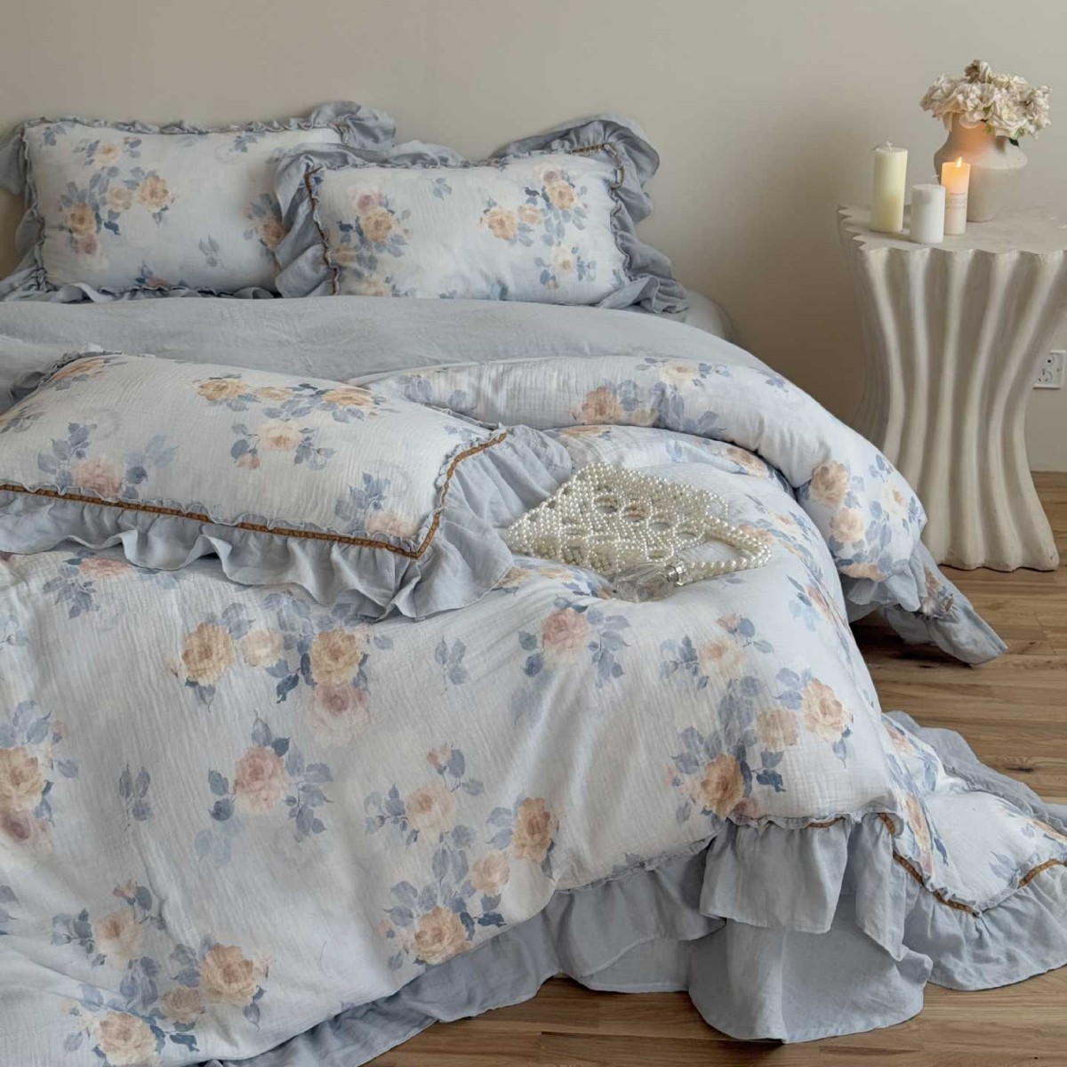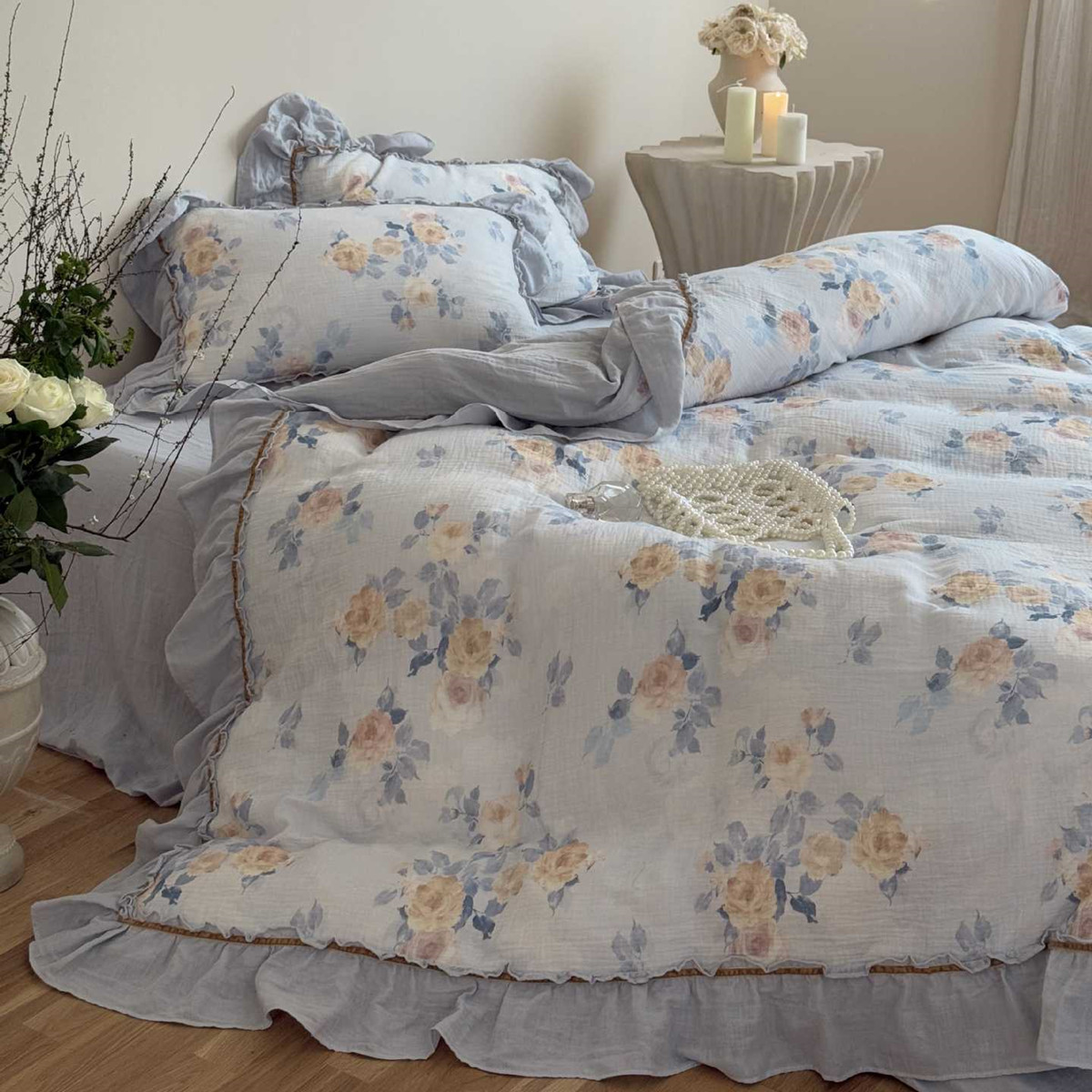 Dusty Blue Floral Gauze Bedding Set – Ruffled Elegance