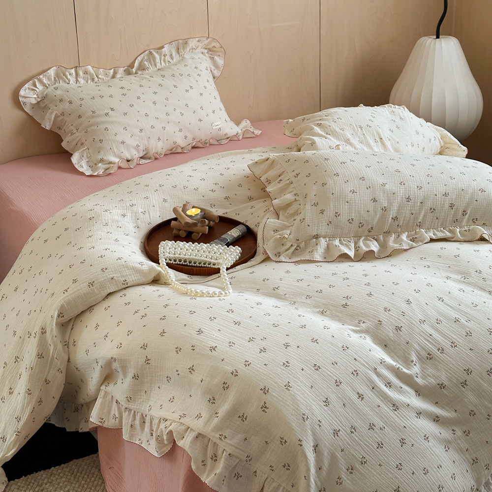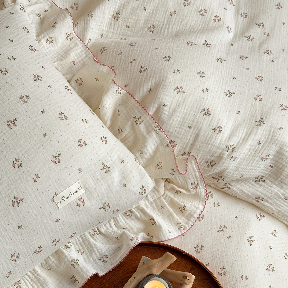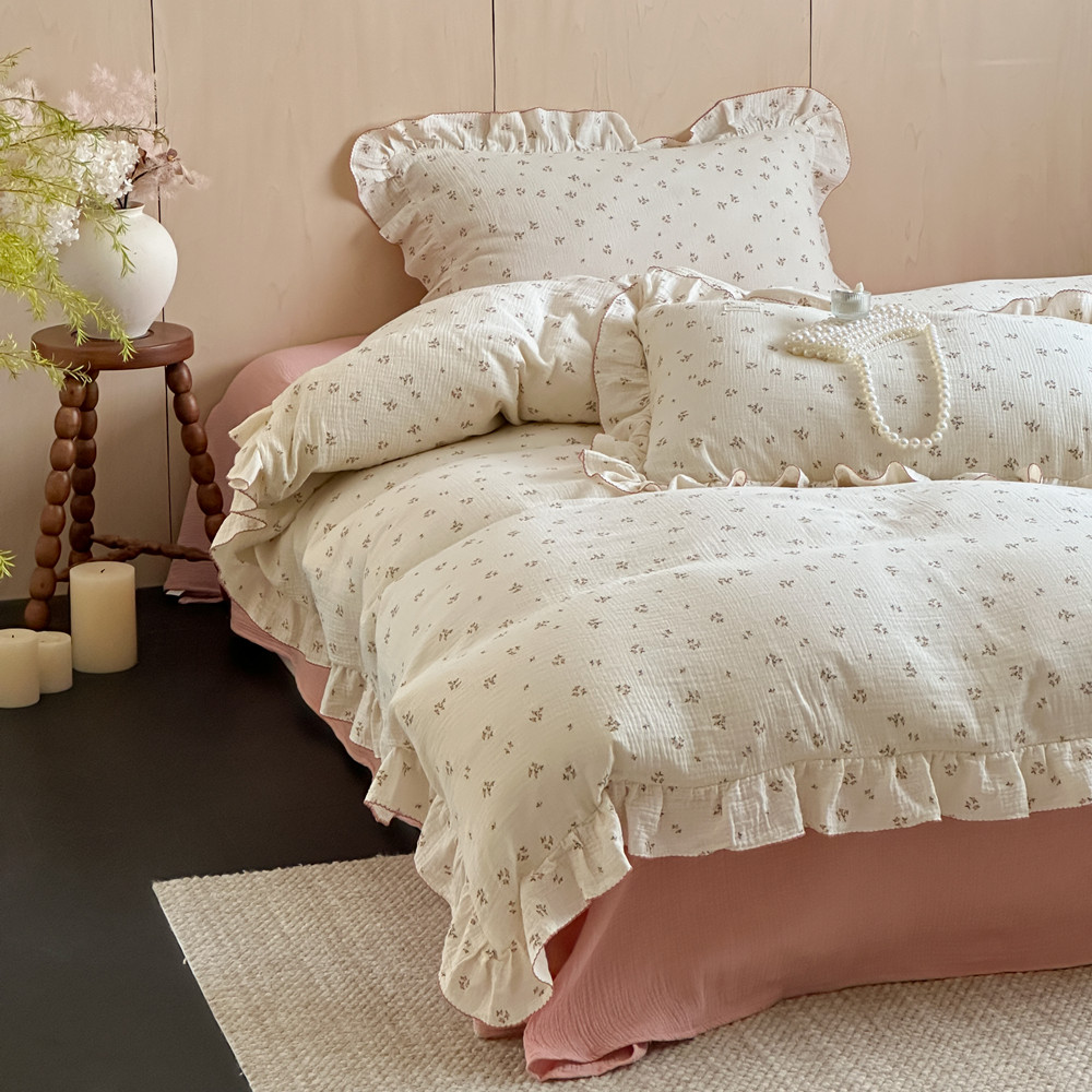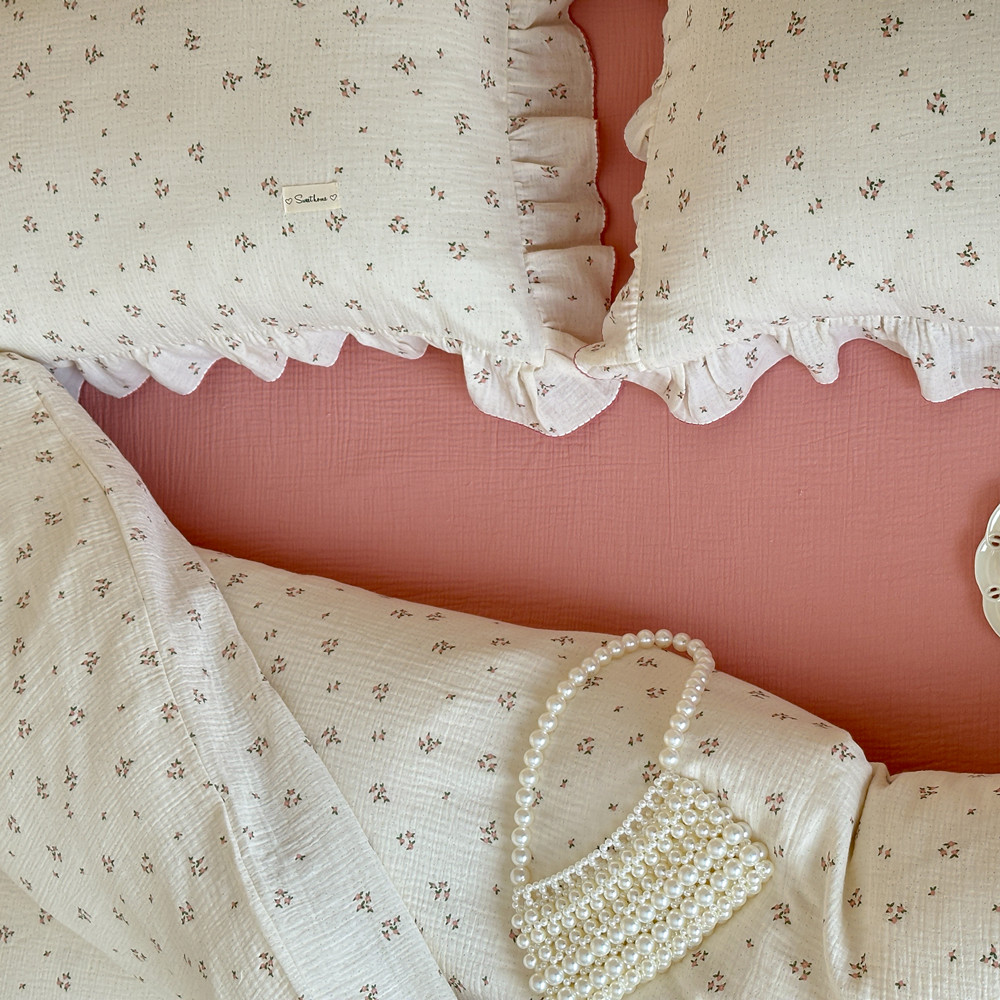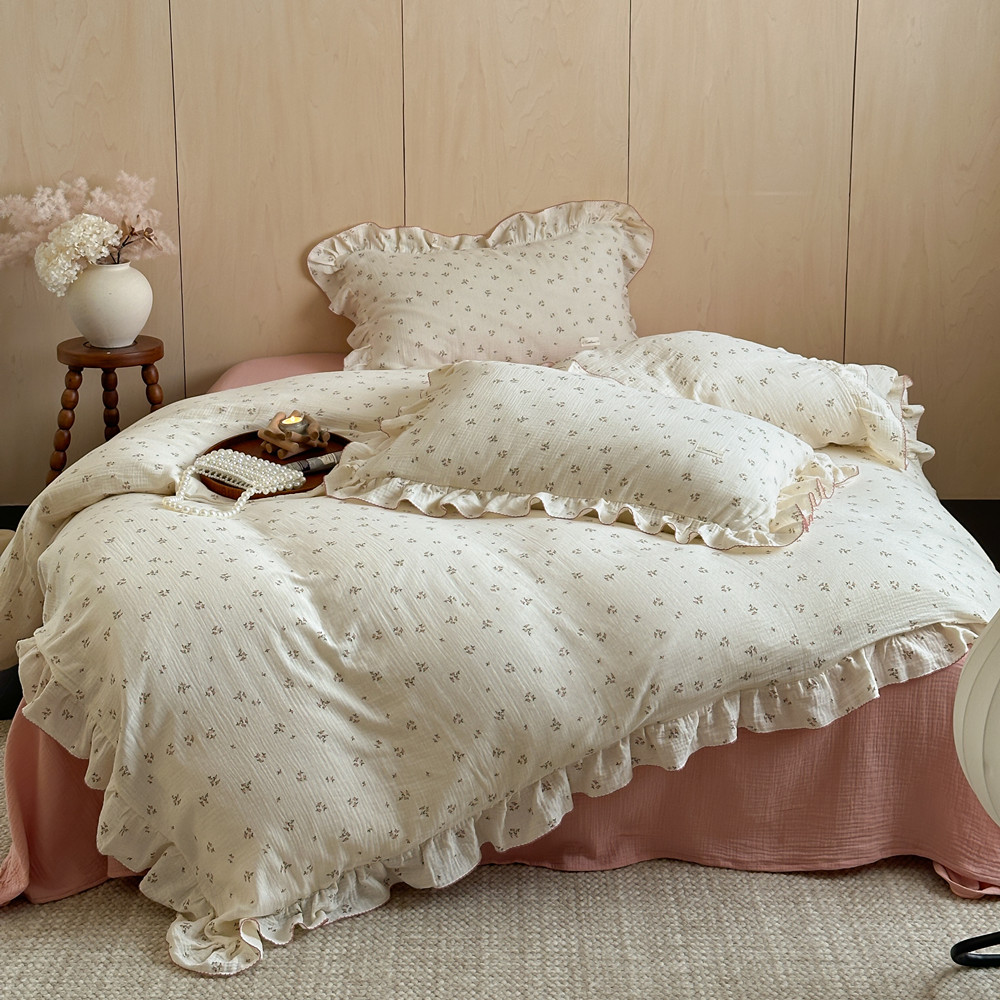 Transform your room with this floral duvet cover set with ruffle detail, designed to bring out the dreamer in you. The soft cream background is peppered with tiny pink blossoms, creating a vintage floral look that feels fresh, youthful, and nostalgic all at once. Whether you’re going for a cottagecore vibe or simply adding a romantic touch, this print is subtle yet expressive.