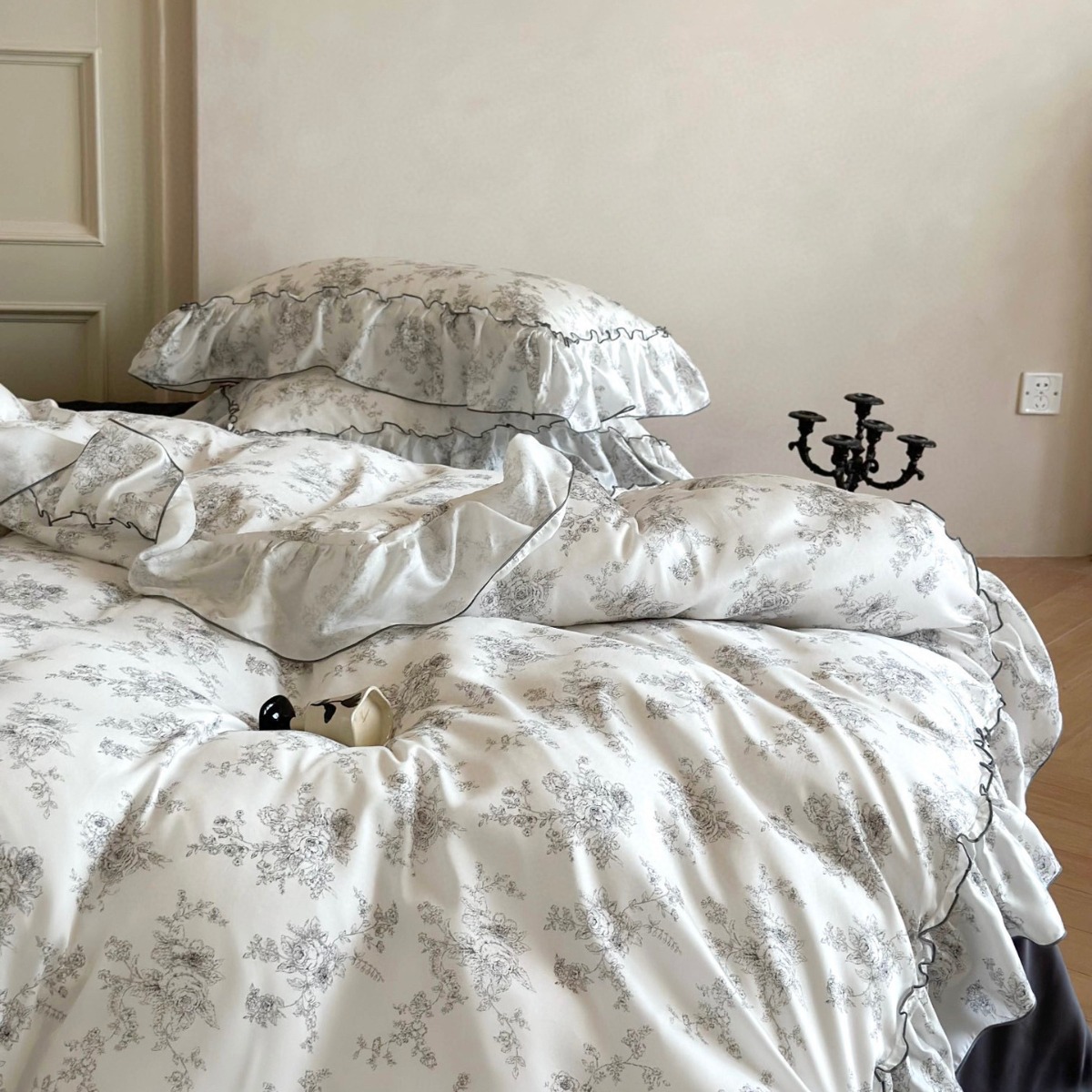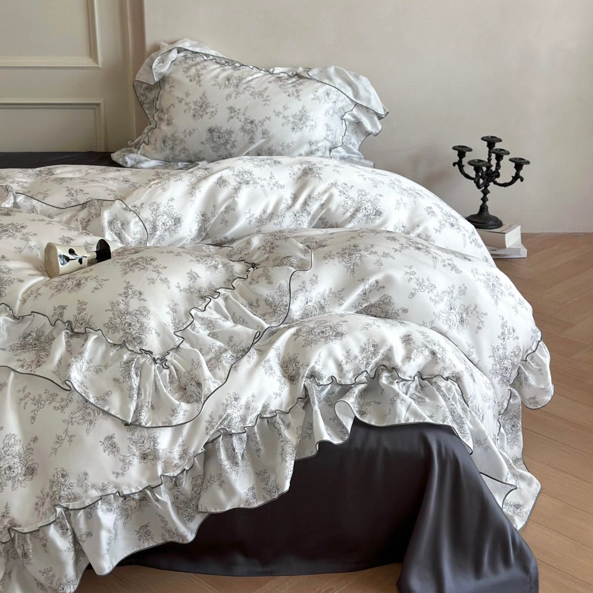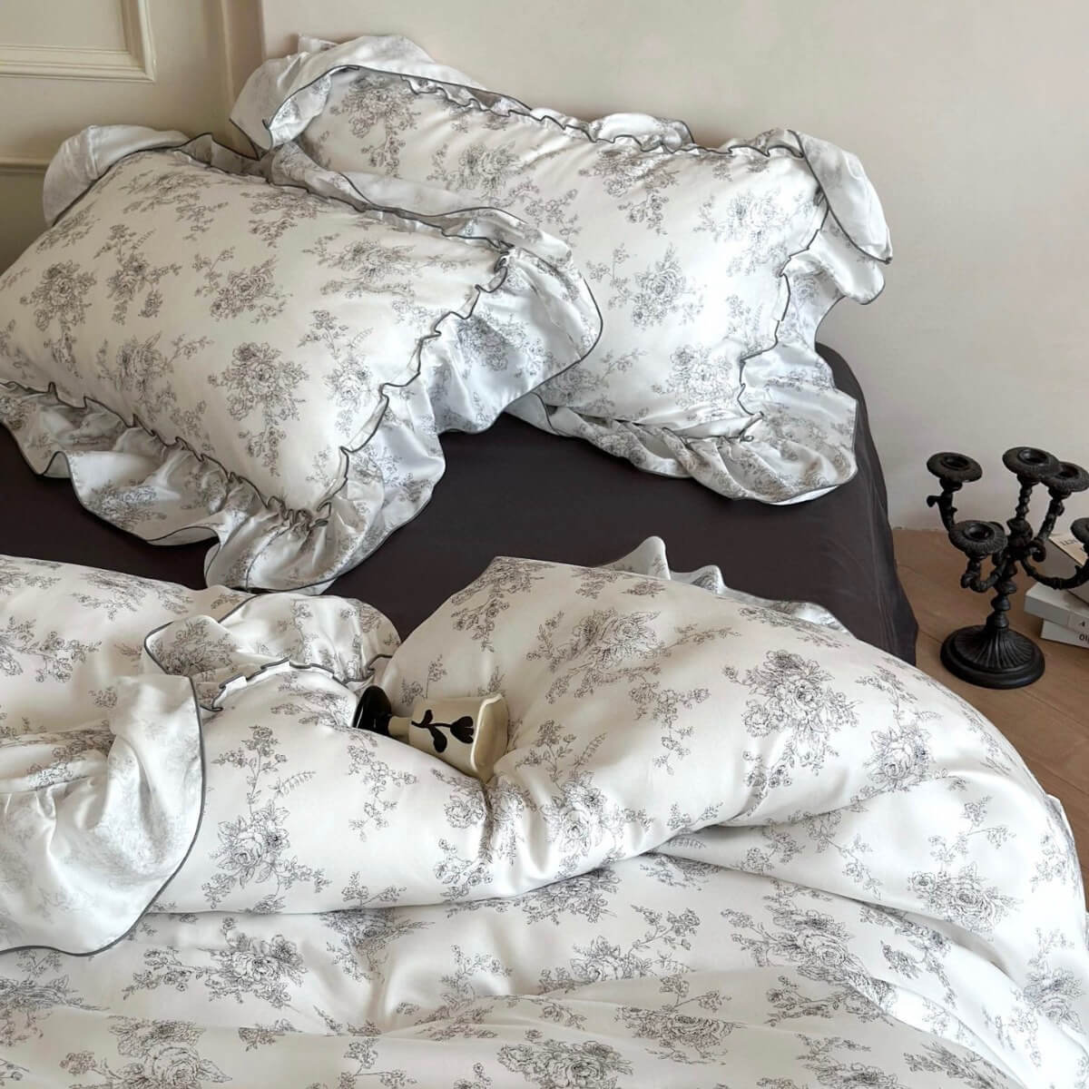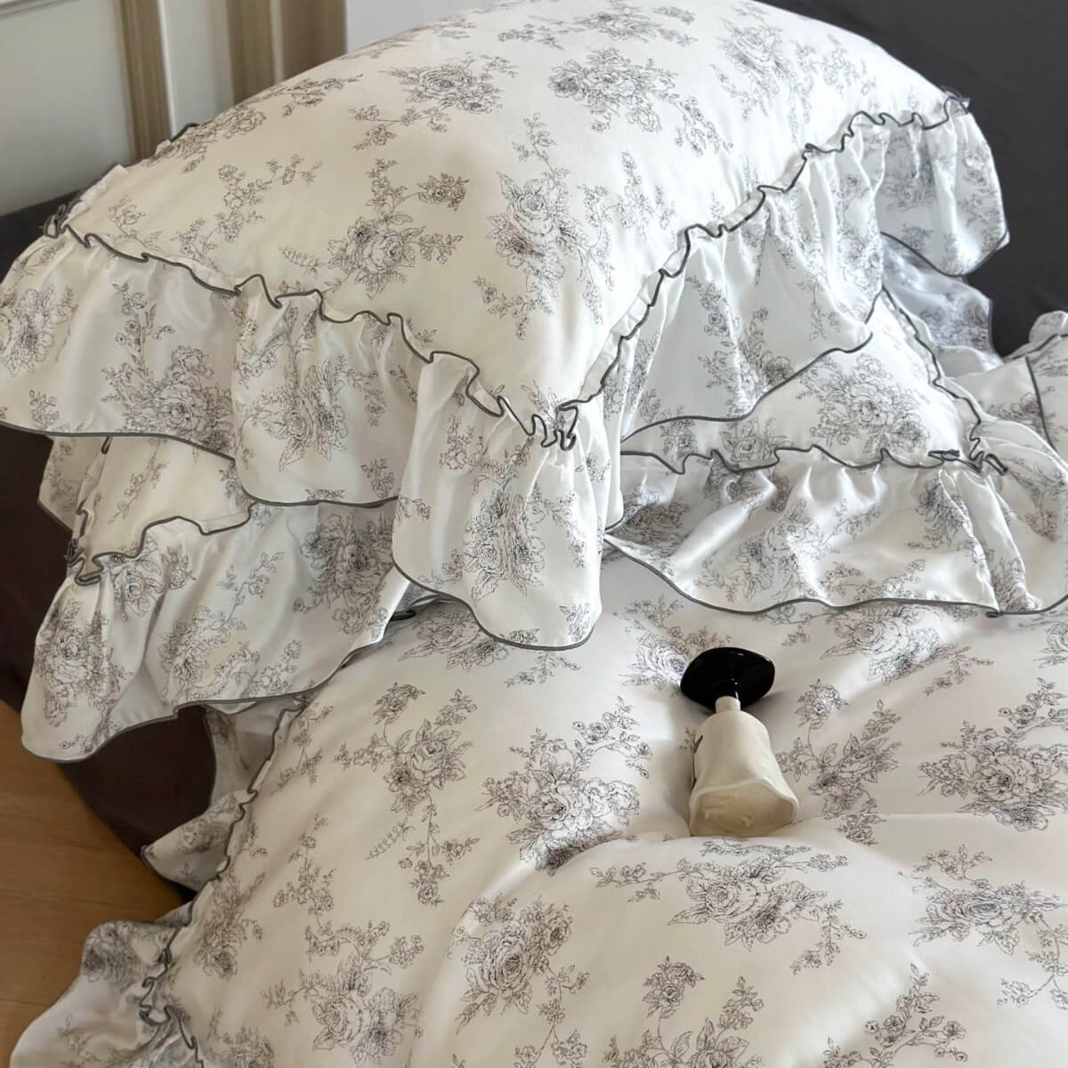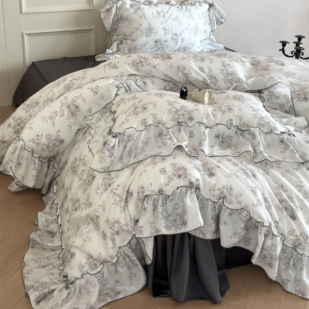 Transform your bedroom into a tranquil escape with the Lyocell Floral Ruffle Bedding Set, inspired by the charm of vintage French interiors. The ivory-white base is gently brushed with hand-drawn grey florals, creating a soft, romantic backdrop. Framed by gracefully gathered ruffles, the entire set evokes the timeless softness of countryside manors and Parisian apartments.