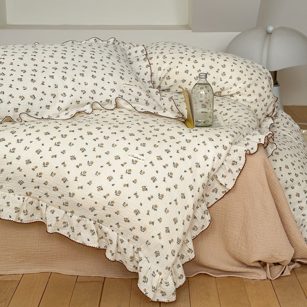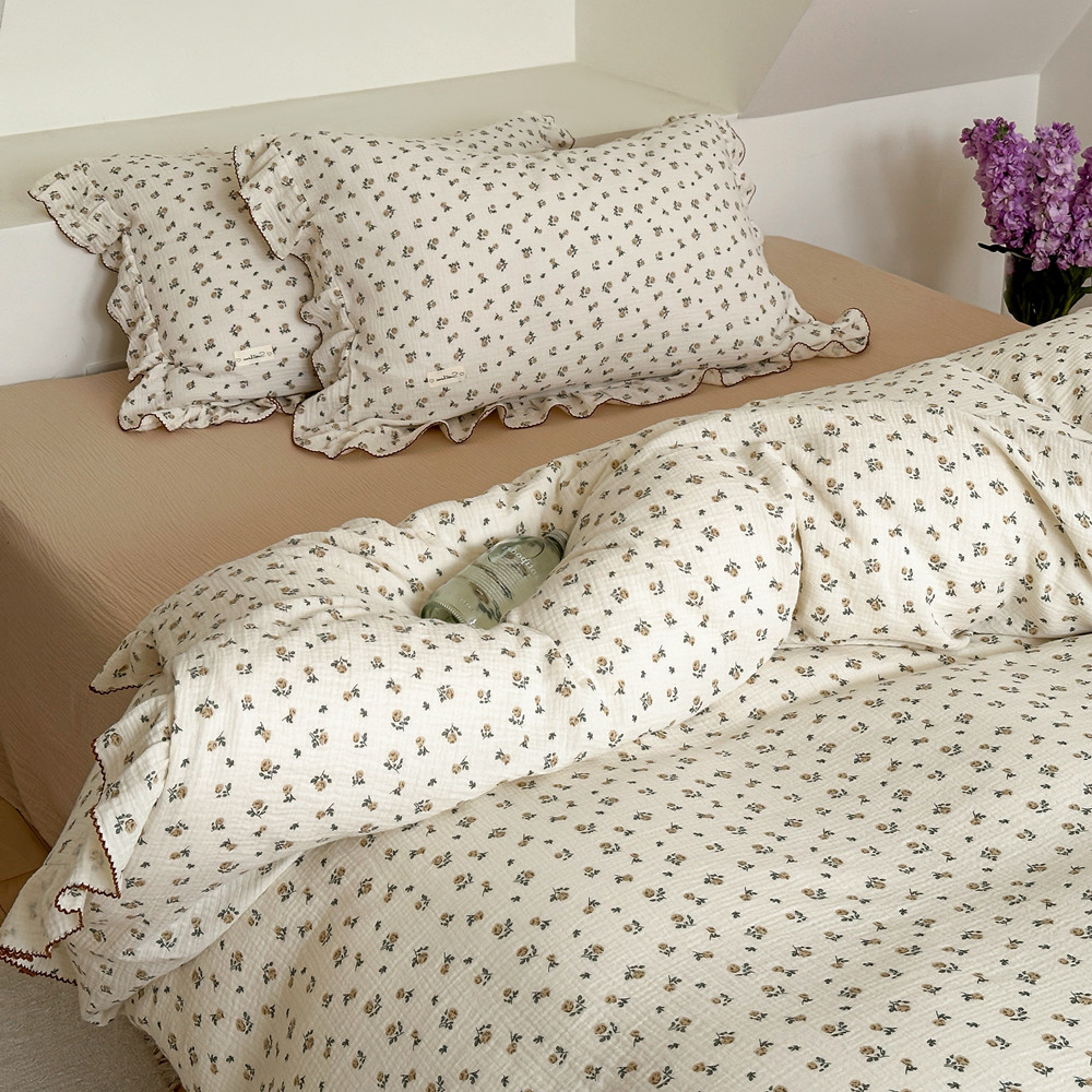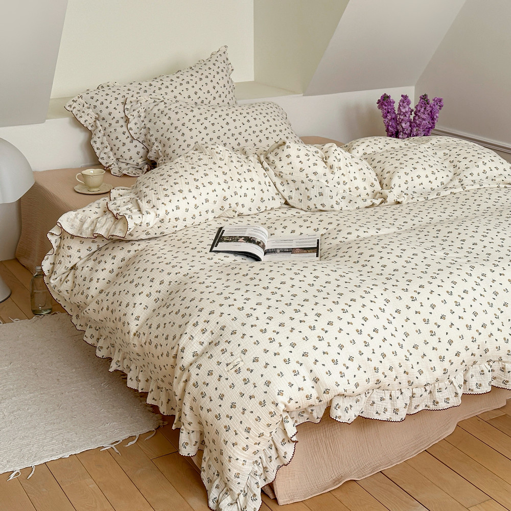 The ruffled duvet cover and pillowcases add texture, movement, and a hint of whimsy. Paired with a coordinating flat sheet in a warm neutral tone, the full floral bedding set creates a beautifully layered look that works equally well in romantic, cottagecore, or country-style bedrooms.