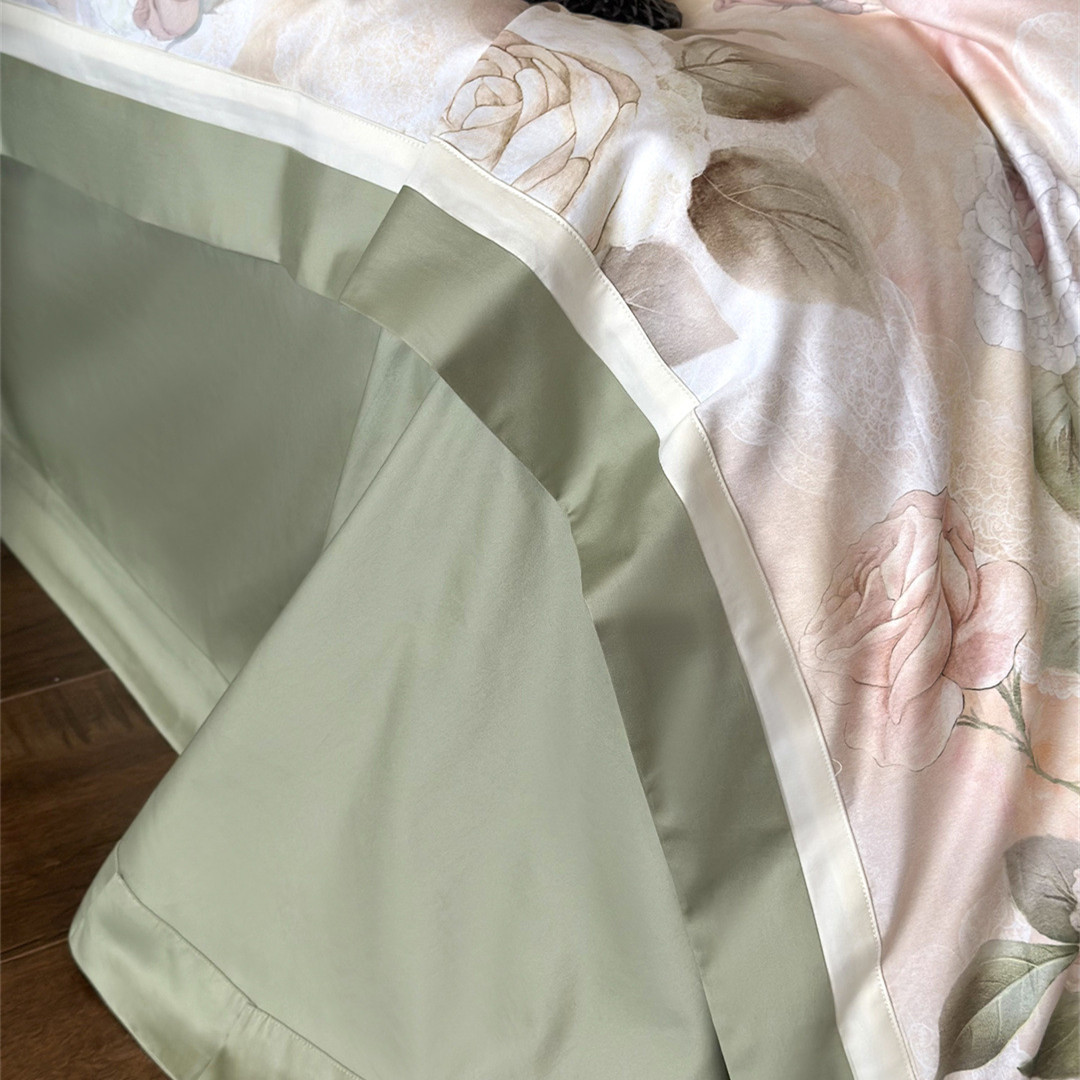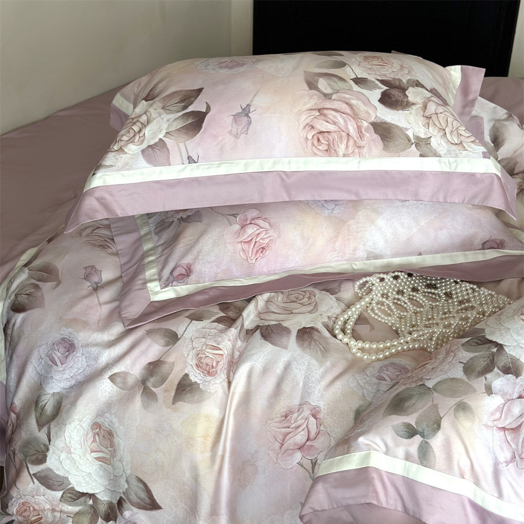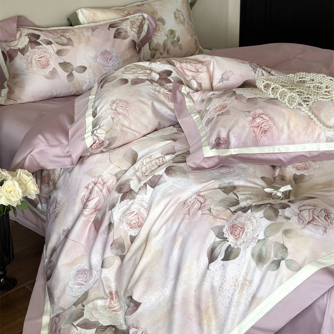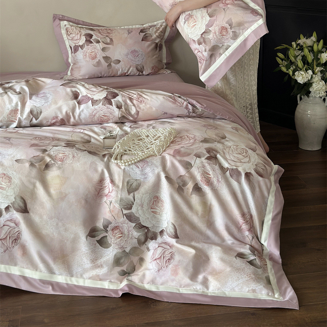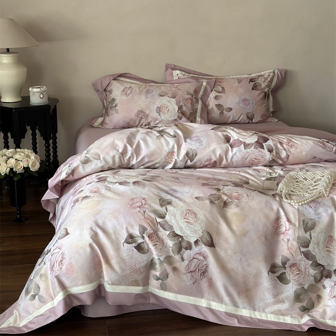 The rose print bedding set features delicate blooms in soft blush tones, enhanced through digital printing.