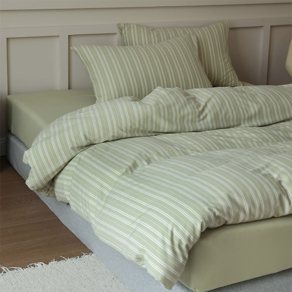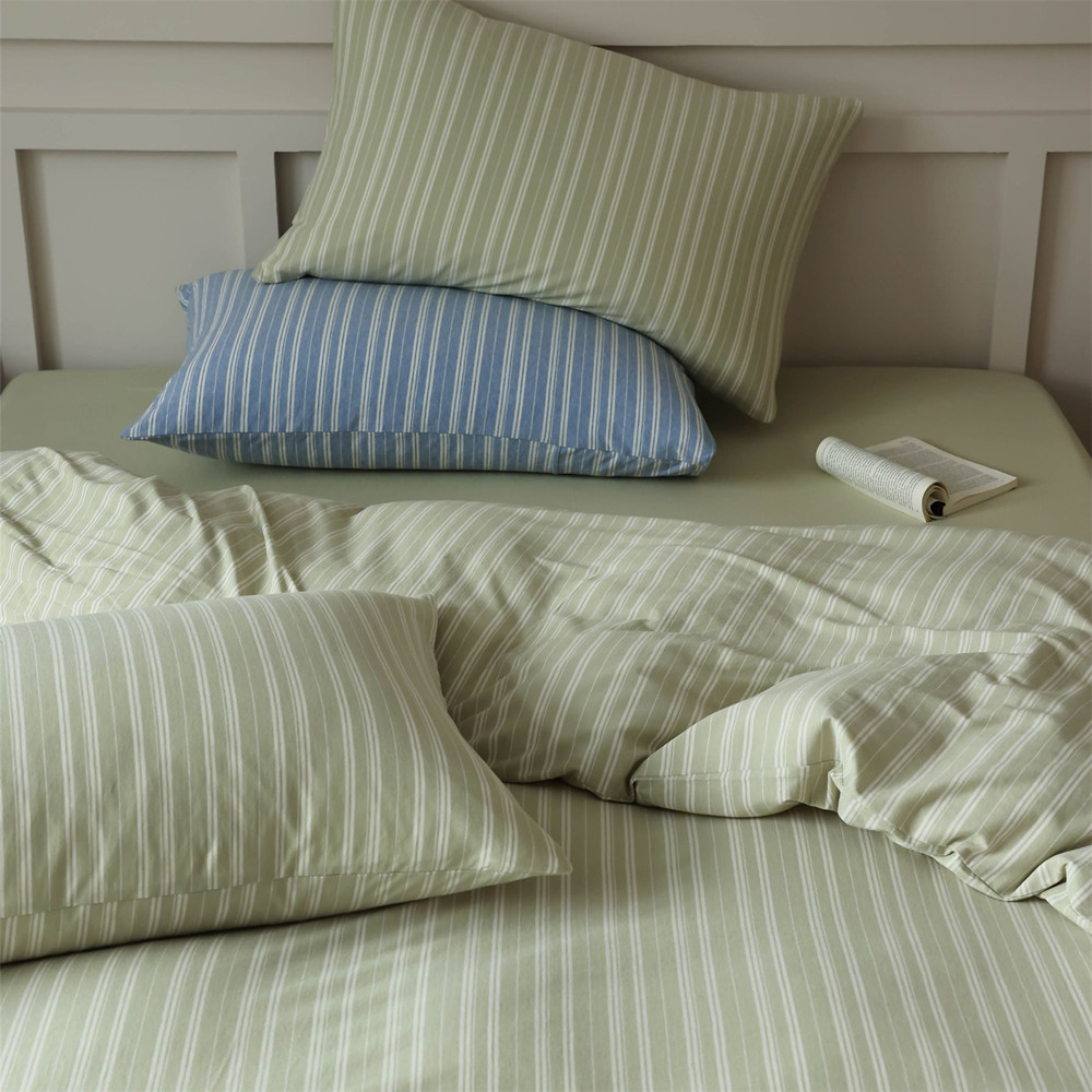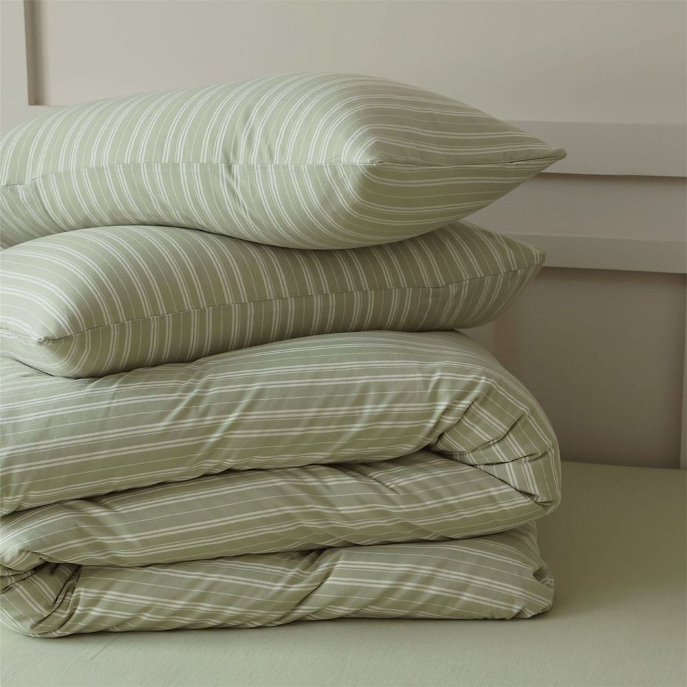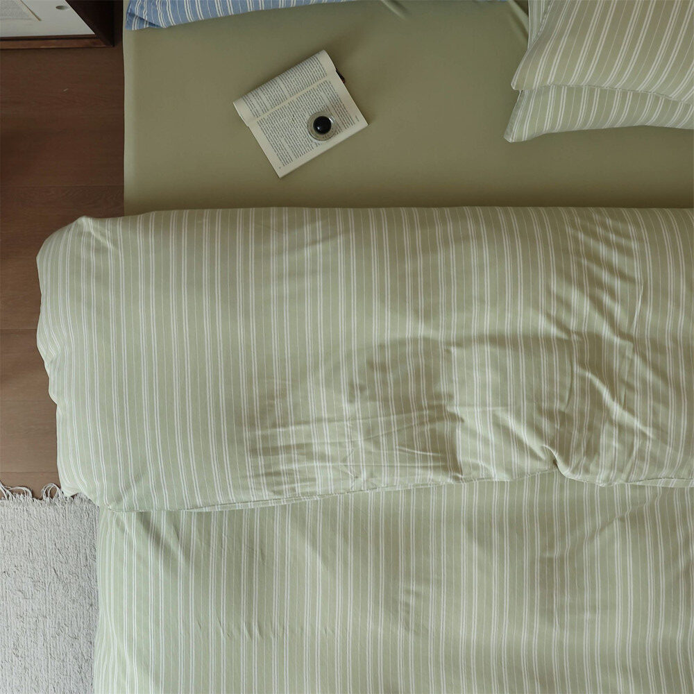The set includes a striped duvet cover and matching pillowcases, complemented by a solid flat sheet in a coordinated tone. Functional design elements like zipper closures and inner corner ties keep your duvet securely in place and your bed looking polished. It’s a seamless blend of simplicity and convenience—ideal for modern, low-maintenance lifestyles.