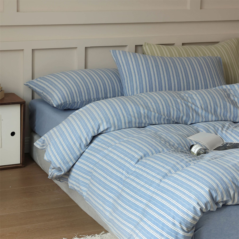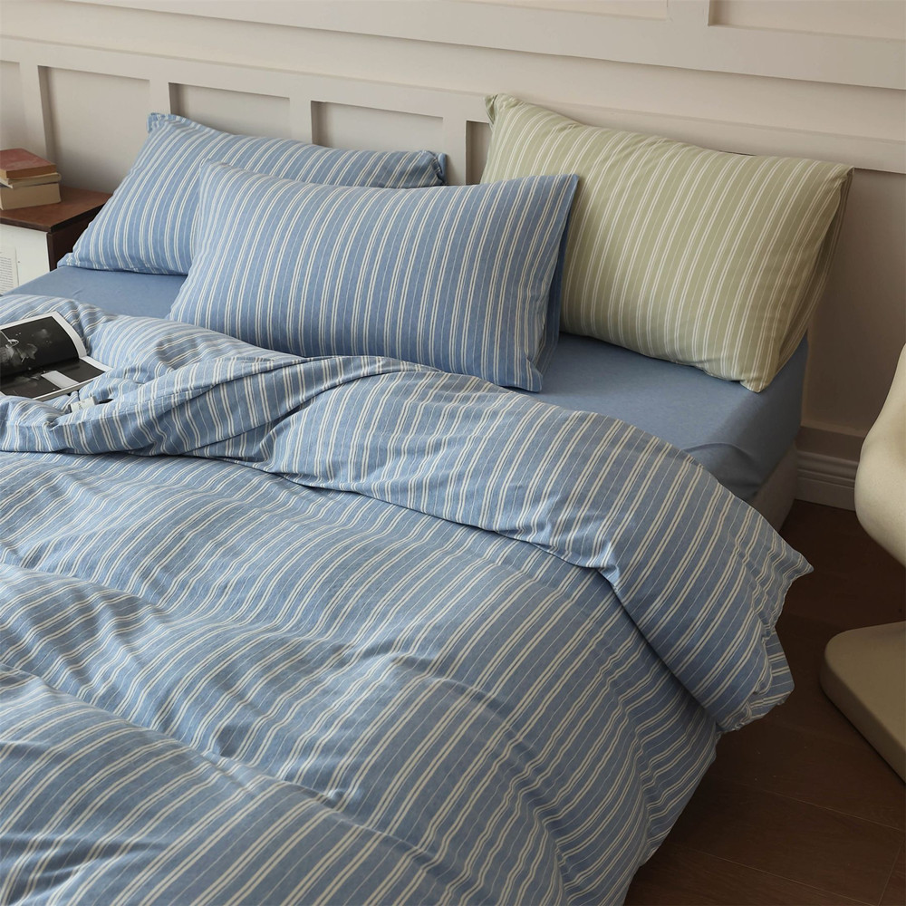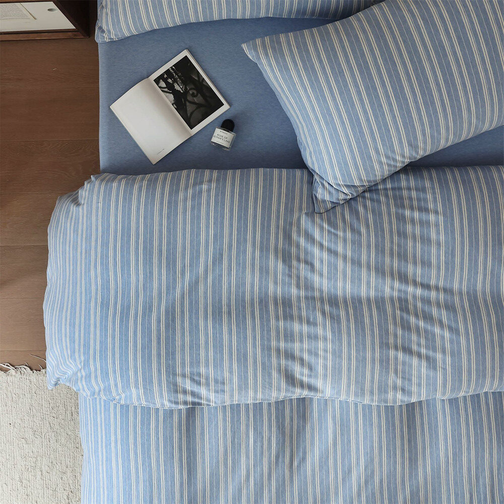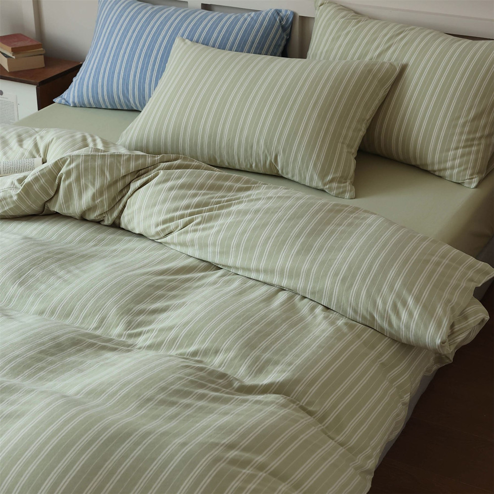The set includes a striped duvet cover and matching pillowcases, complemented by a solid flat sheet in a coordinated tone. Functional design elements like zipper closures and inner corner ties keep your duvet securely in place and your bed looking polished. It’s a seamless blend of simplicity and convenience—ideal for modern, low-maintenance lifestyles.