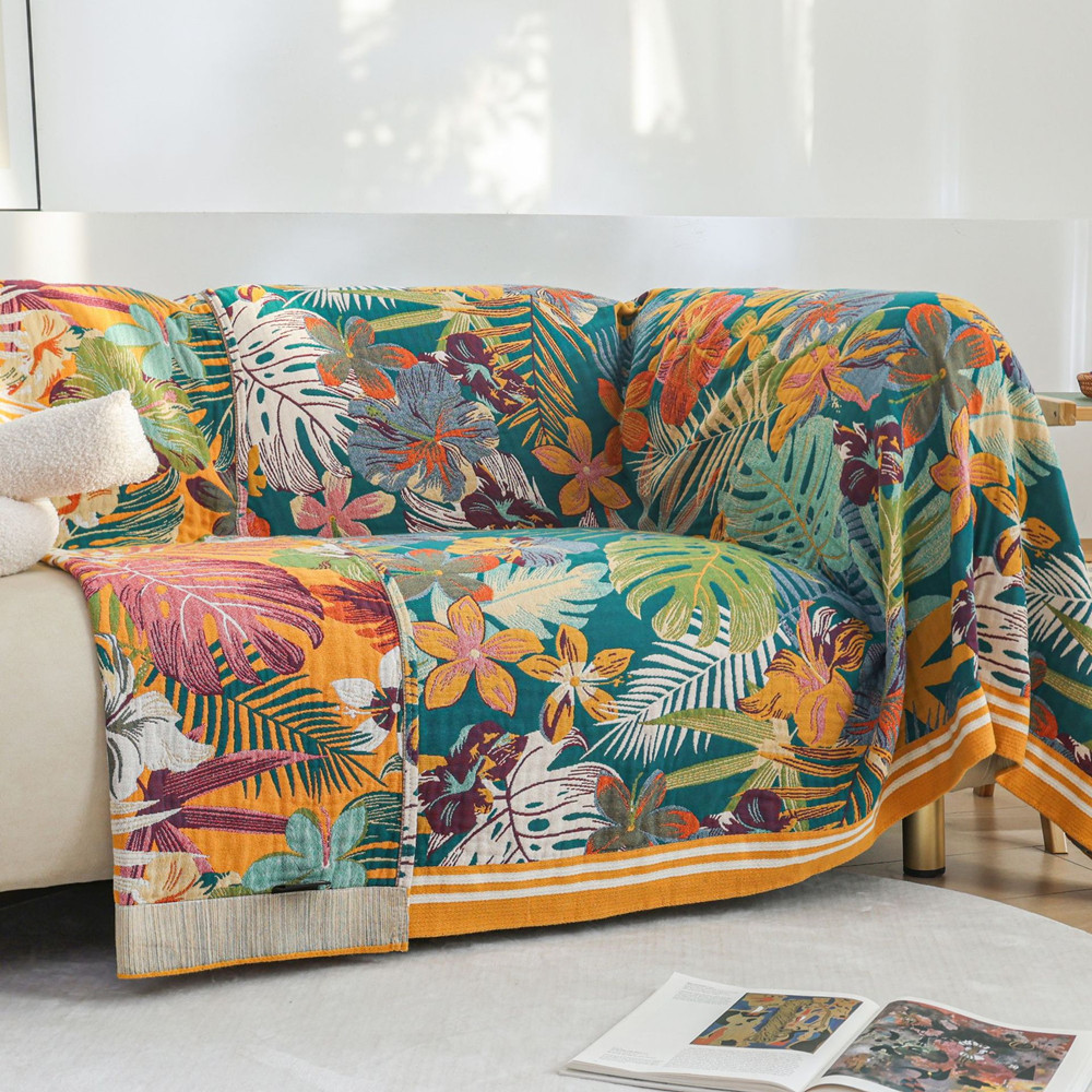 This reversible cotton throw blanket features a dual-toned front and back, allowing you to shift moods with a simple flip. One side bursts with golden florals; the other leans deeper and cooler—both sides alive with tropical energy.